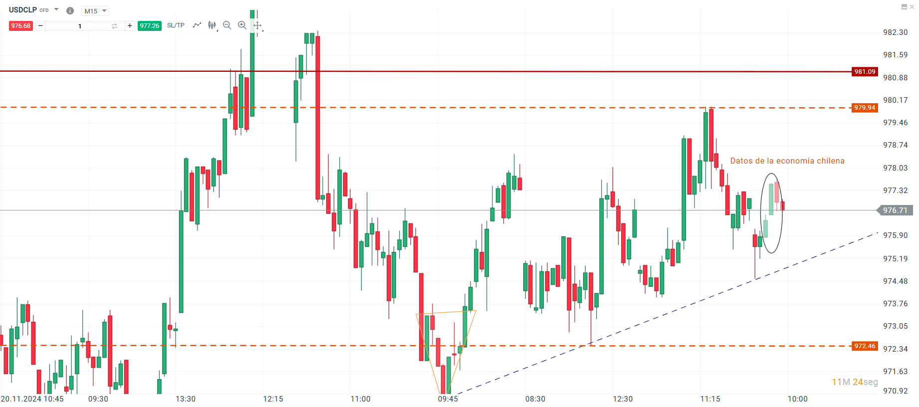 El peso chileno comenzó la jornada con avances, cotizando en torno a 975 por dólar, impulsado por un contexto de baja liquidez debido al feriado en Estados Unidos. Sin embargo, tras la publicación de los datos económicos de Chile, la moneda local recortó sus beneficios, reflejando una ligera presión al alza en el tipo de cambio, que alcanzó un máximo de 977, tras haber tocado mínimos de 974 en el día de hoy.