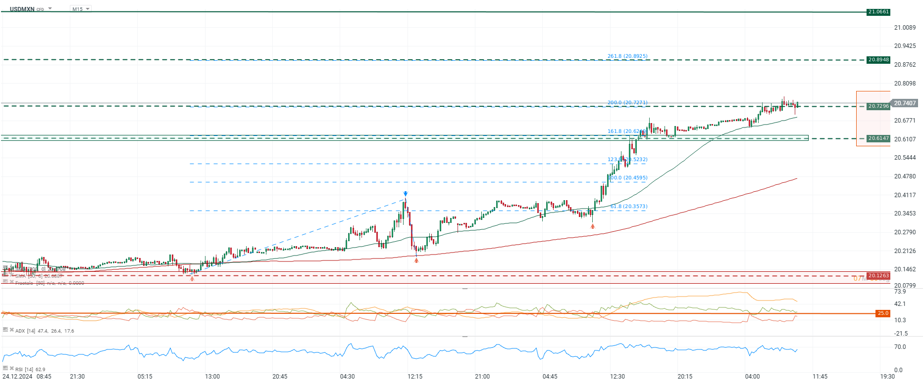 El USDMXN cotiza en 20.74 tras un impulso alcista, consolidándose cerca del 161.8% de Fibonacci. Un quiebre por encima de 20.74 podría llevar al precio hacia 20.89 y 21.06, con soporte en 20.61 y 20.45 en caso de retrocesos. RSI sugiere espacio al alza, mientras el ADX confirma fuerza en la tendencia actual.