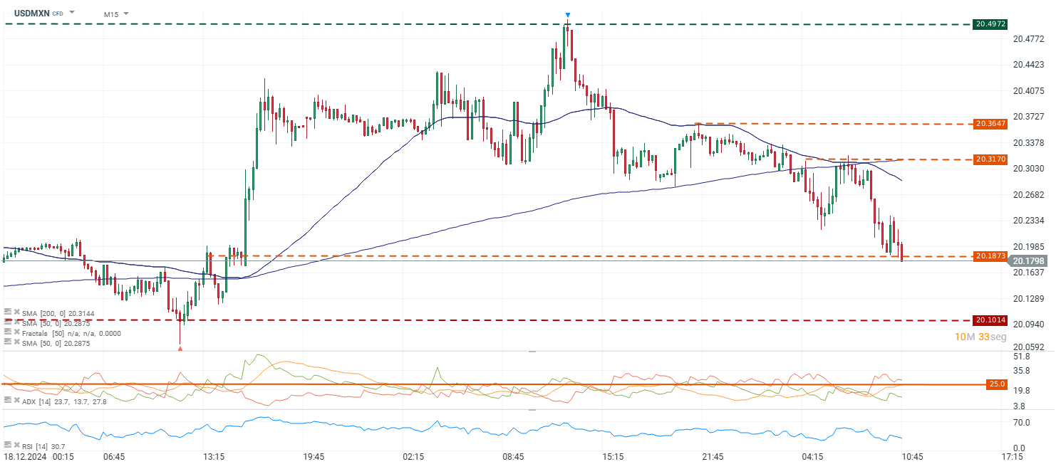 - El máximo de 20.34 fue alcanzado en la apertura, mientras que la recuperación lo llevó a acercarse al soporte de 20.18.