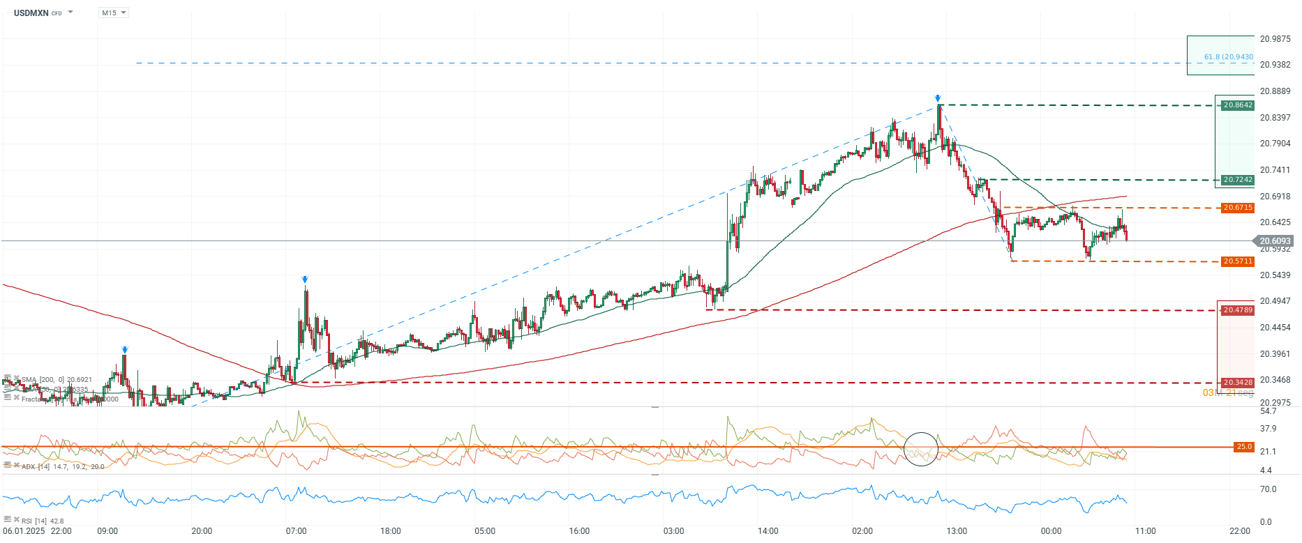 El USD/MXN se encuentra actualmente en 20.6093, consolidándose tras una corrección bajista desde los máximos en 20.86. La SMA 200 está actuando como resistencia dinámica en la zona de 20.6918, mientras que el soporte inmediato se ubica en 20.5711. El RSI muestra momentum neutral, mientras el ADX indica debilidad en la tendencia actual. Fuente: xStation5.