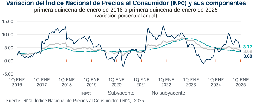 En la primera mitad de enero de 2025, el Índice de Precios al Consumidor (IPC) subyacente en México aumentó un 0.28%, comparado con el 0.5% de la primera mitad de diciembre y las previsiones del 0.23%. La tasa de inflación subyacente anual subió ligeramente al 3.72%, desde el 3.62% de diciembre, superando levemente las expectativas del 3.68%. Por otro lado, la tasa de inflación general mensual aumentó un 0.2%, la menor en cuatro meses, mientras que la tasa anual cayó al 3.69%, la más baja en cuatro años.
