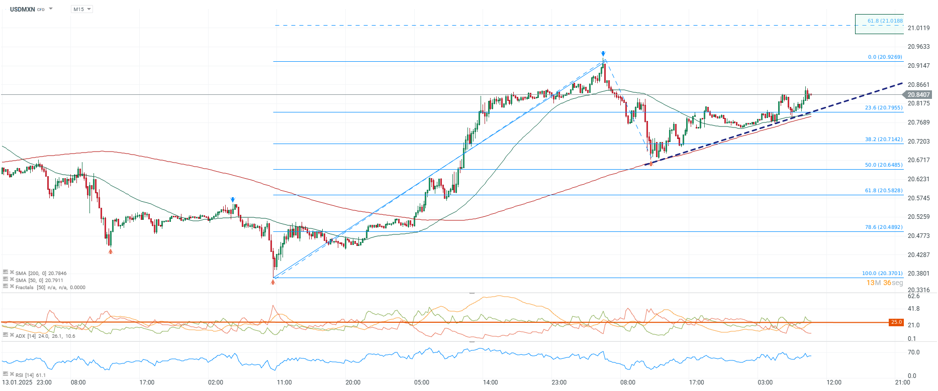 El USD/MXN se encuentra actualmente en la zona de 20.86, manteniendo una estructura alcista respaldada por una línea de tendencia ascendente desde niveles más bajos. El precio ha superado el retroceso del 23.6% de Fibonacci en 20.79, lo que refuerza el impulso alcista. Fuente: xStation5.