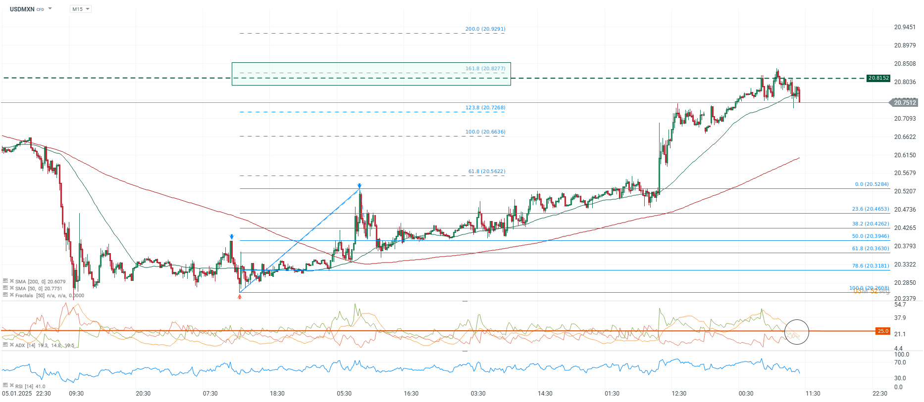 El USDMXN se encuentra en 20.7512 tras alcanzar la resistencia en 20.8152, correspondiente al nivel de extensión Fibonacci del 161.8%. El par muestra un retroceso moderado, pero mantiene una estructura alcista respaldada por medias móviles ascendentes. Fuente: xStation5.