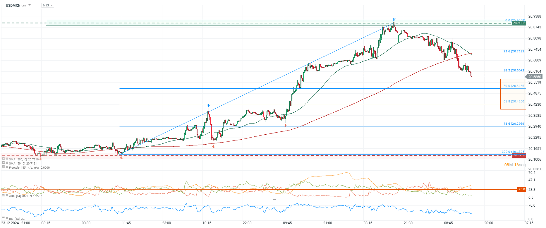 El USDMXN se encuentra actualmente en 20.5860, con un retroceso desde máximos cercanos a 20.90. El precio ha roto el soporte en 20.6073, que coincide con el nivel de retroceso de Fibonacci del 38.2%. El RSI se encuentra en niveles de sobreventa, lo que sugiere presión bajista, mientras que el ADX indica pérdida de fuerza en la tendencia. Si el precio logra recuperar el nivel de 20.6073, podría impulsar un movimiento hacia 20.7195 (retroceso 23.6% de Fibonacci) como primer objetivo, con una extensión hacia 20.8743 en caso de mayor impulso. Sin embargo, si el precio continúa a la baja, el siguiente soporte clave está en 20.5166 (nivel 50% de Fibonacci), con un objetivo adicional en 20.4260 (retroceso 61.8%).