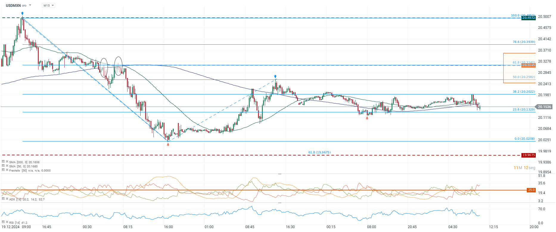 El USDMXN opera en 20.15, rebotando desde el soporte en 20.13 (23.6% de Fibonacci) y mostrando rechazo en 20.31 (61.8%). Las medias móviles indican consolidación, mientras el RSI sugiere momentum bajista moderado. Si supera 20.20, podría alcanzar 20.31 y luego 20.39. A la baja, perder 20.13 abriría camino hacia 20.02 y 19.96. Fuente: xStation5.
