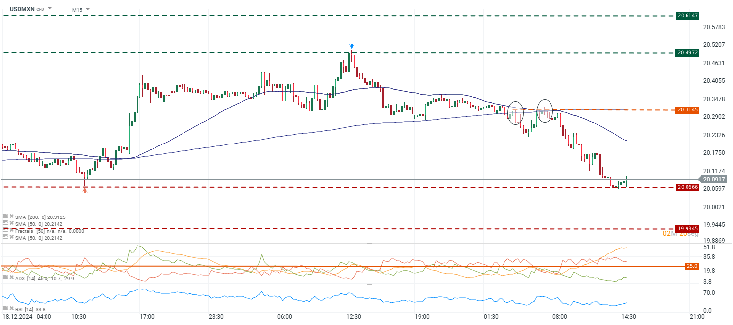 El USDMXN cotiza en 20.09 tras un retroceso desde 20.31, con soporte en 20.06 y presión bajista predominante. El RSI muestra sobreventa y el ADX indica tendencia débil. Si rompe 20.10, podría avanzar hacia 20.20 y 20.31. Por debajo de 20.06, el próximo soporte clave está en 19.93. Fuente: xStation5.