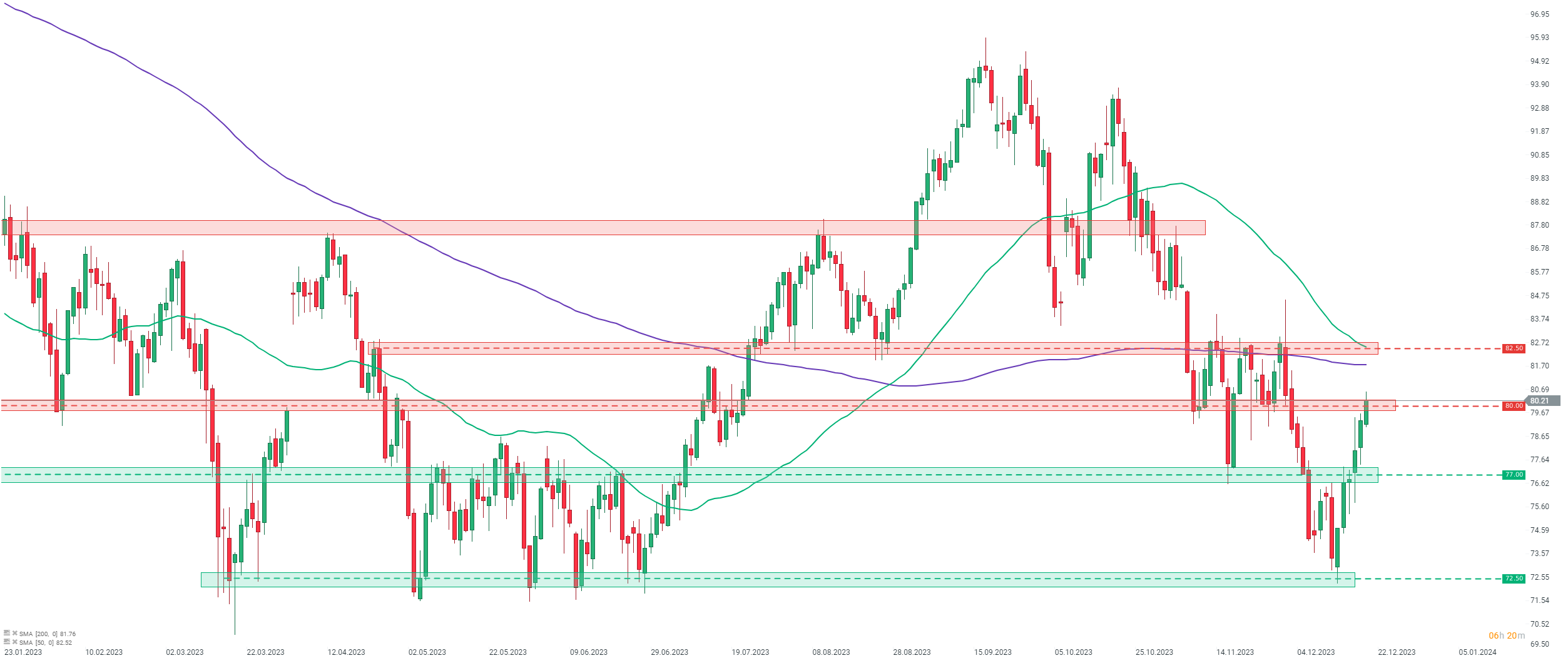 El Brent (petróleo) cotiza más de un 1% en el día, incluso a pesar de que los datos de inventarios de EE.UU. muestran aumentos en las reservas de petróleo crudo, gasolina y destilados. El Petróleo se cotiza alrededor de un 11% por encima de un mínimo intradiario alcanzado el 13 de diciembre de 2023. Si observamos el gráfico D1, podemos ver que los alcistas ahora están intentando lograr una ruptura clara por encima de la zona de resistencia de $80. Si tienen éxito, se abriría camino hacia la siguiente zona de resistencia: el área de $82,50, marcada con reacciones de precios anteriores y una media móvil de 50 sesiones (línea verde).