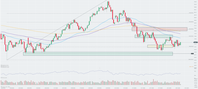 El petróleo crudo WTI cotiza actualmente cerca de la barrera de los 73 dólares por barril y se ha estado moviendo en un canal de consolidación relativamente estrecho durante bastante tiempo. Su límite inferior se encuentra adicionalmente en la estructura del 78,6% de retroceso Fibonacci de la onda ascendente iniciada en mayo de 2023. El límite superior del canal mencionado puede en el mediano plazo correr en la región de la EMA exponencial de 50 días (curva azul). y el 61,8% Fibonacci.