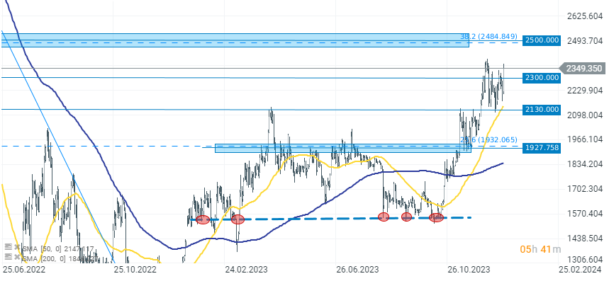 Al observar el gráfico, podemos notar un rebote dinámico en la segunda criptomoneda más grande después de probar la primera zona de soporte alrededor de $2130. Desde entonces, los precios de ETH han aumentado constantemente y, después de una breve corrección en los últimos días, los precios de hoy están superando el nivel de $2300 y se dirigen hacia el área de $2400, donde se encuentra el nivel de resistencia más cercano.