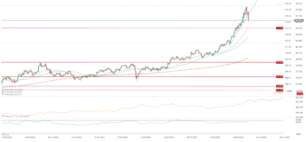 El precio retrocede significativamente, cayendo por debajo de los 50 dólares por onza. Además, se está rompiendo la línea de tendencia alcista acelerada, iniciada en la segunda quincena de septiembre. Si esta corrección se extiende más allá de una toma puntual de benficios, el siguiente nivel de soporte clave se sitúa en los 47 dólares por onza, coincidiendo con la media móvil de 30 días.