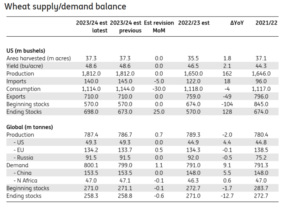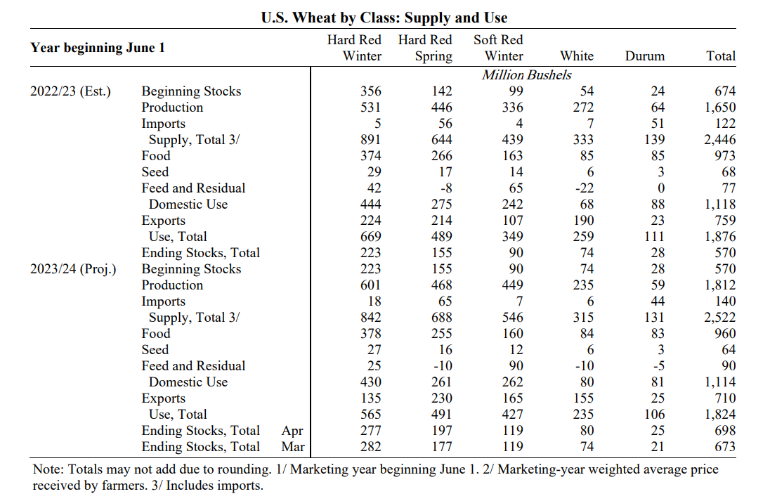 Existencias de trigo de EE. UU. y temporada de producción 2022/2023 frente a 2023/2024. Fuente: USDA