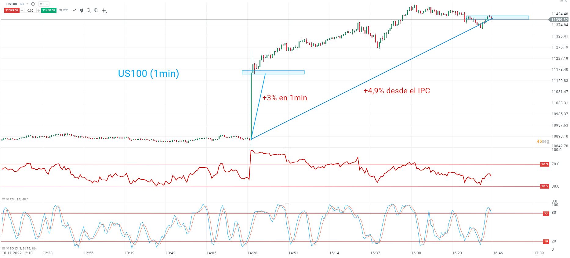 El selectivo tecnológico Nasdaq (US100) acumula una revalorización del 5,29% en la jornada de hoy tras el buen dato de IPC que podría marcar un cambio de tendencia en la política monetaria de la FED.