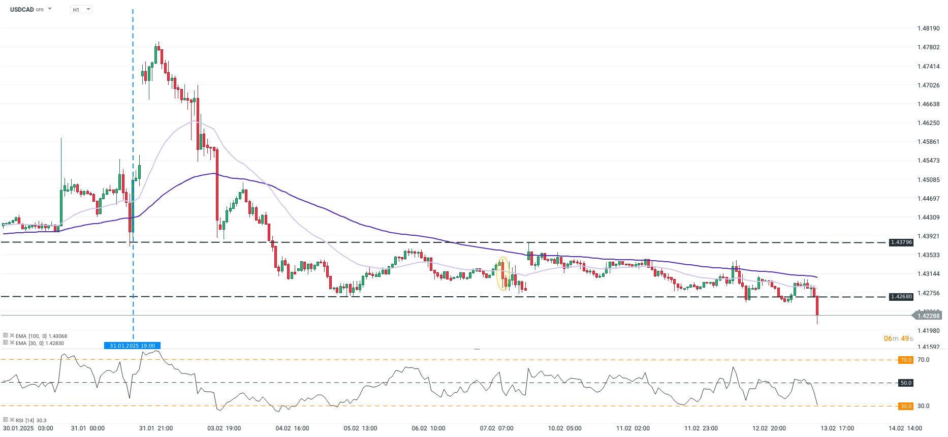 El tipo de cambio del USDCAD ha caído por debajo de un nivel de soporte clave, cotizando a su nivel más bajo en dos meses alrededor de 1,4228. Fuente: xStation5