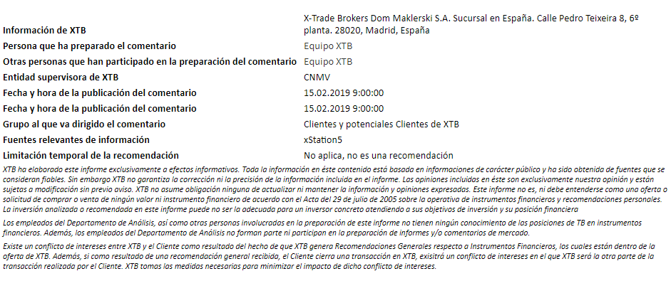 "Este informe se proporciona sólo con fines de información general y con fines educativos. Cualquier opinión, análisis, precio u otro contenido no constituyen asesoramiento de inversión o recomendación en entendimiento de la ley de Belice. El rendimiento en el pasado no indica necesariamente los resultados futuros, y cualquier persona que actúe sobre esta información lo hace bajo su propio riesgo. XTB no aceptará responsabilidad por ninguna pérdida o daño, incluida, sin limitación, cualquier pérdida de beneficio, que pueda surgir directa o indirectamente del uso o la confianza de dicha información. Los contratos por diferencias (""CFDs"") son productos con apalancamiento y acarrean un alto nivel de riesgo. Asegúrese de comprender los riesgos asociados. "