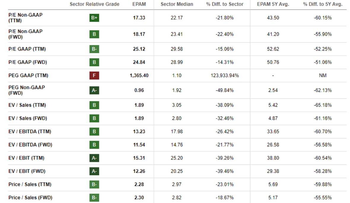 La caída en el precio de la acción de EPAM Systems ha llevado a un reajuste de los múltiplos financieros de la compañía, reflejando una potencial infravaloración según los estándares del sector y sus propios promedios históricos. Actualmente, el múltiplo de Precio/Ganancias Futuras (Forward P/E) de EPAM se sitúa en 24.84, lo cual es notablemente inferior a la media del sector, que es de 28.99, y también está por debajo del promedio de la compañía en los últimos cinco años. Otro múltiplo importante, el Valor de la Empresa sobre EBITDA (EV/EBITDA), también indica una infravaloración, con un valor actual de 11.54.