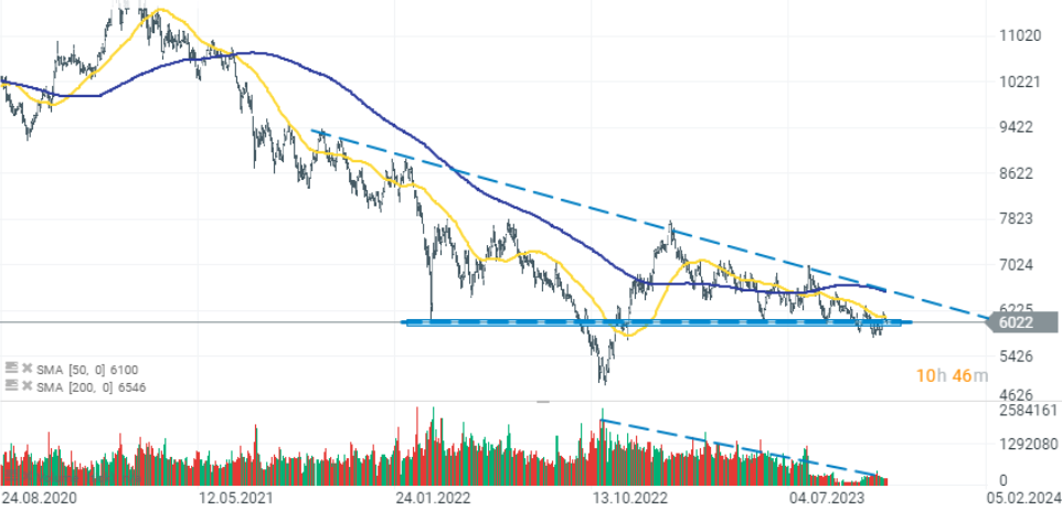 La preocupante situación de la economía china afecta significativamente el sentimiento de los inversores, y vemos su incidencia en los índices bursátiles. El principal índice chino ha mantenido una tendencia a la baja desde mediados de 2021. El volumen de operaciones también muestra una tendencia a la baja, lo que indica un menor interés de los inversores en este mercado, pero también cierto rechazo a vender acciones chinas en sus niveles actuales.