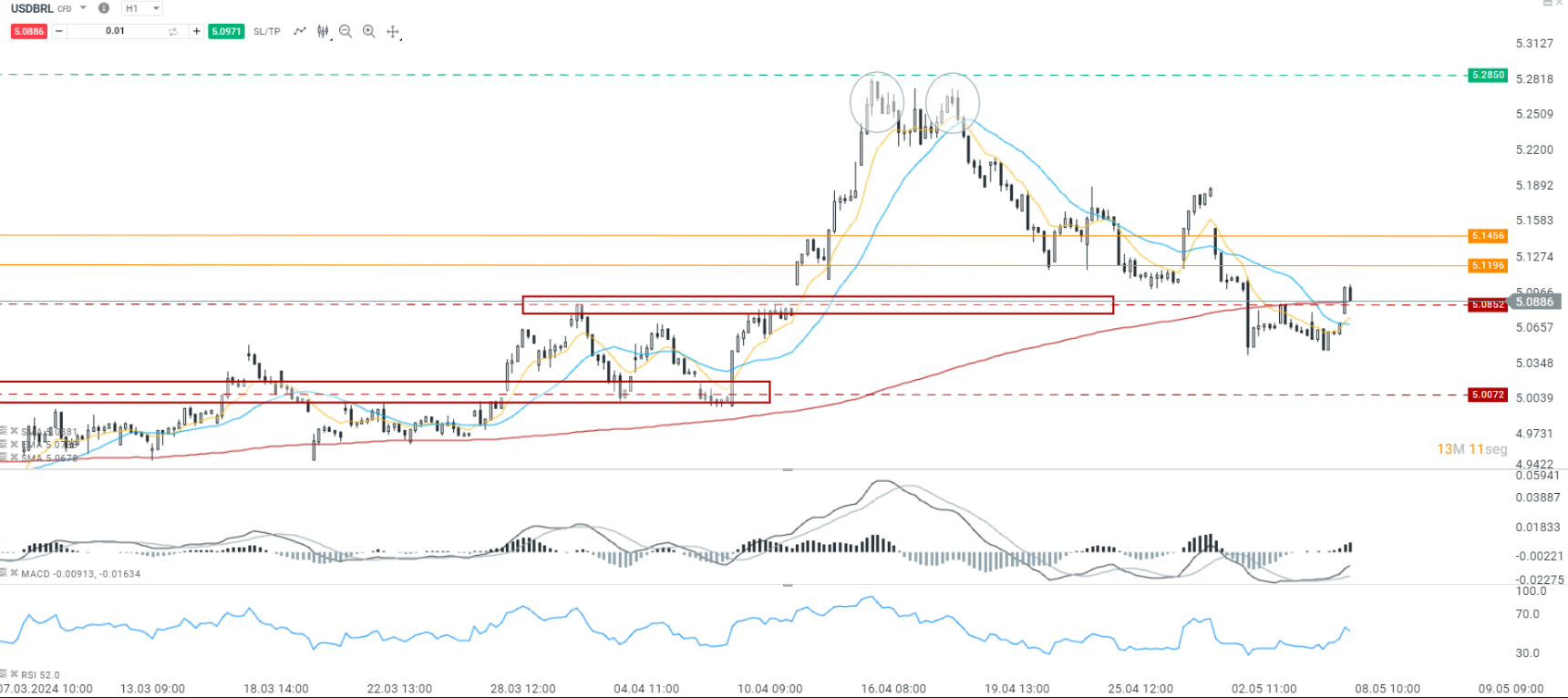 - Escenario Bajista: Si el par no logra mantenerse por encima de 5.0886, podría retroceder hacia el soporte inmediato en 5.0072.