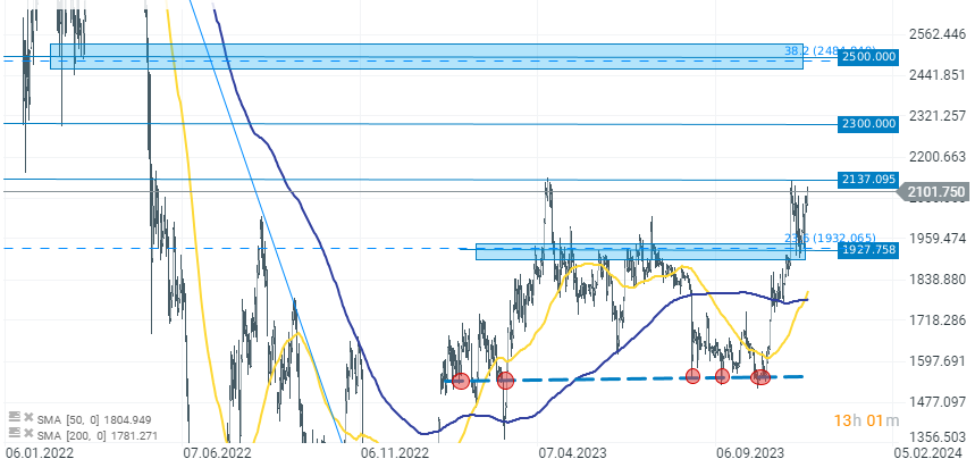 A raíz de las noticias recientes, Ethereum sube más del 2% y supera de nuevo los 2.100 dólares, mientras que hace apenas unos días el precio cayó a alrededor de 1.930 dólares. Si la tendencia continúa, es posible que veamos un intento de superar los máximos de este año en Ethereum, que hasta ahora se mantiene detrás de Bitcoin en rendimiento. Un nivel digno de mención es el de 2.140 dólares. Si los alcistas logran superar esta zona, el siguiente rango a observar es el de 2.300$.