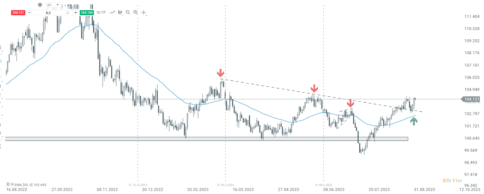 En el análisis de hoy, comenzamos analizando el índice del dólar estadounidense, que, según el análisis técnico, ha comenzado a mostrar señales que pueden atraer la atención de los inversores.