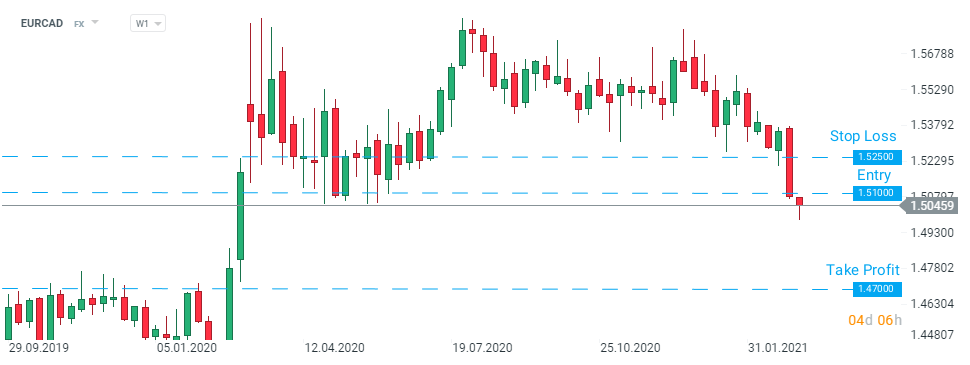 TD Bank recomienda colocar una orden de venta limitada en EURCAD en 1.5100 con un objetivo de 1.4700 y una orden de stop loss en 1.5250. Fuente: xStation5