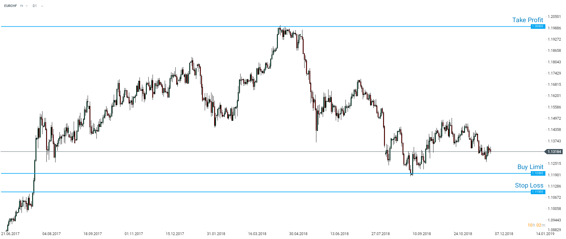 BNP Paribas recomienda tomar una posición limitada larga en EURCHF con una orden límite en 1.1200, un objetivo de 1.2000 y una orde de stop loss order en 1.1100. Fuente: xStation5