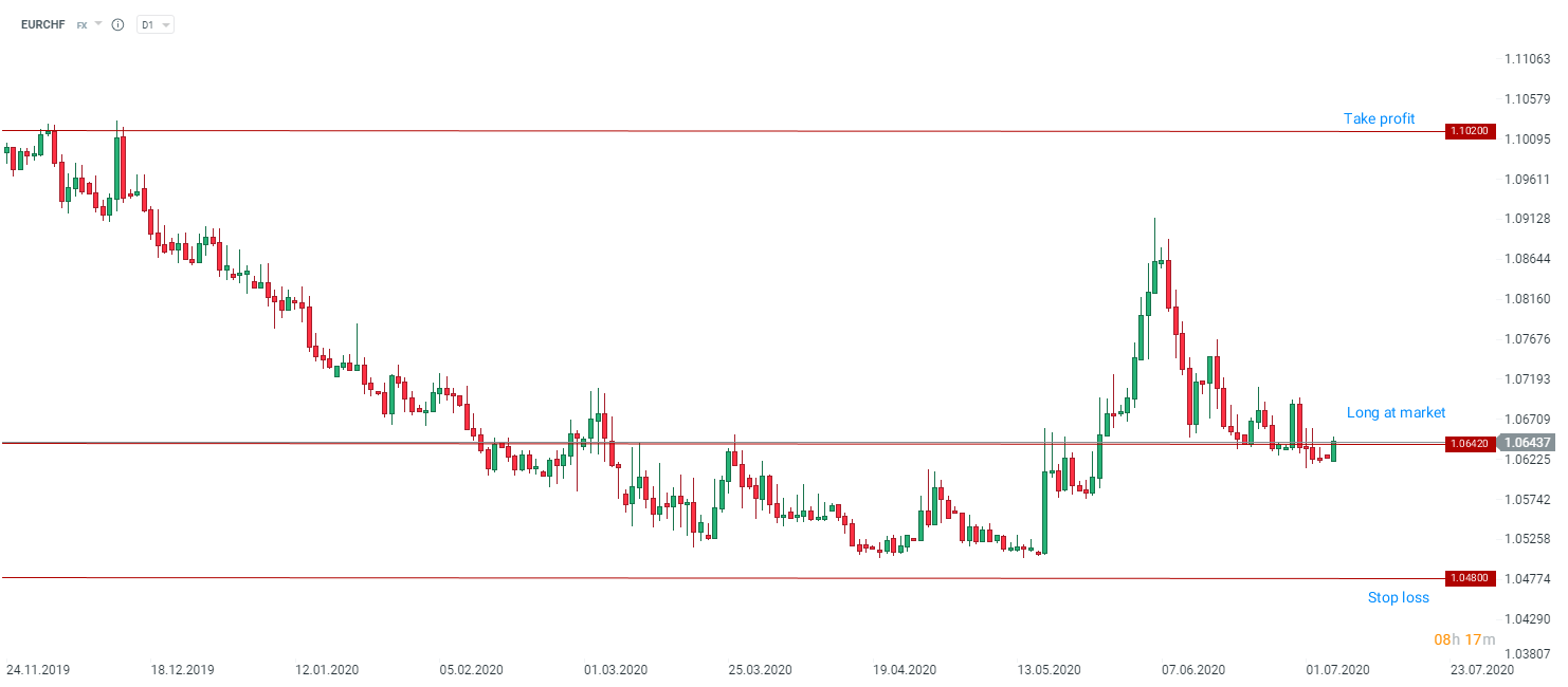 Nordea recomienda tomar una posición larga en EURCHF a precio de mercado con un objetivo de 1.1020 y una orden de stop loss colocada en 1.0480. Fuente: xStation5