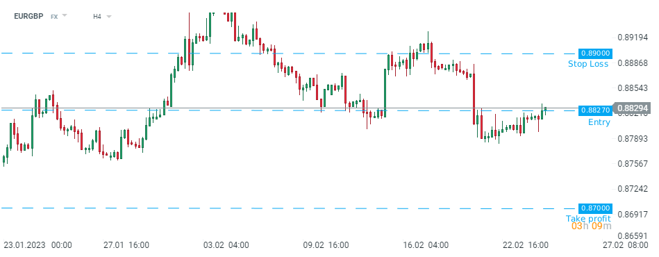 Credit Agricole recomienda tomar una posición corta en EURGBP en 0,8827 con un objetivo de 0,8700 y una orden de stop loss colocada en 0,8900. Fuente: xStation5