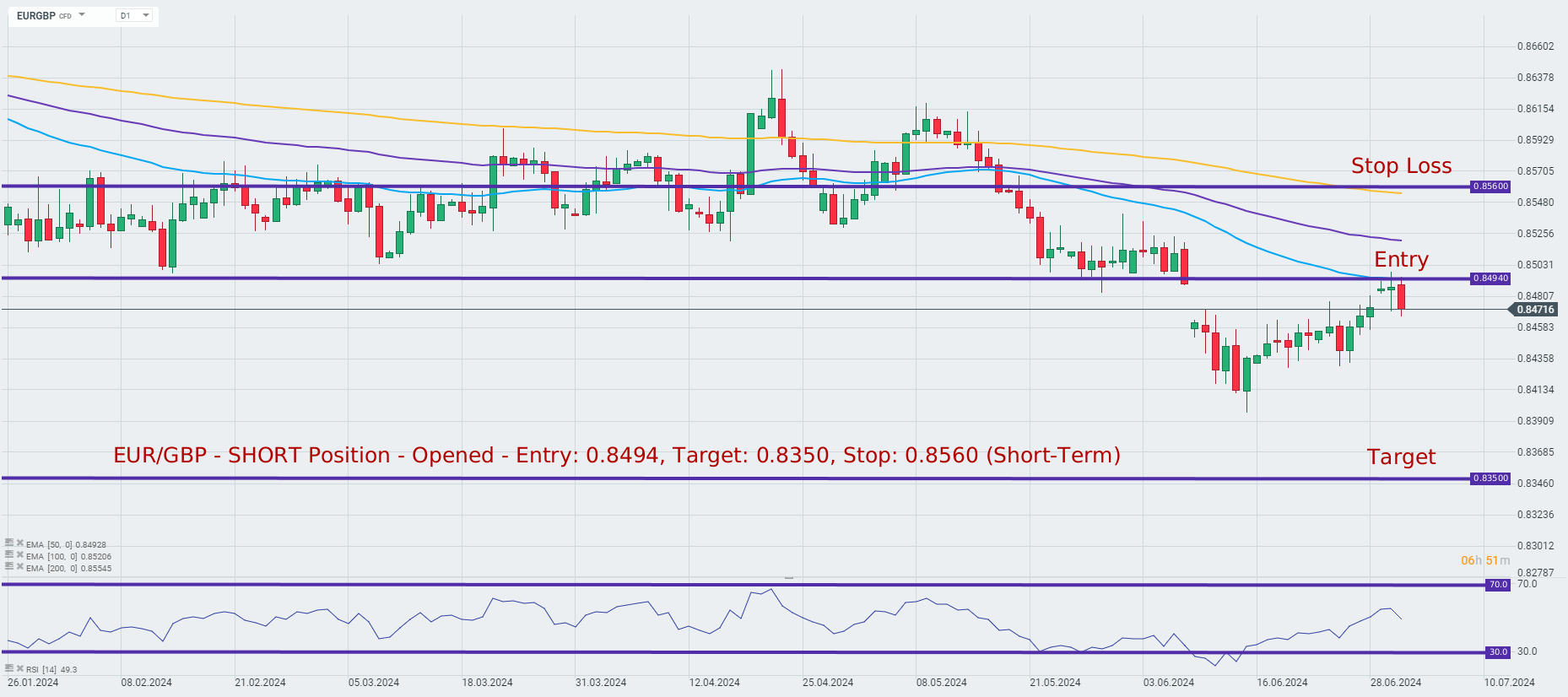 Refinitiv recomienda abrir una posición corta en EURGBP al precio de mercado con un objetivo de 0,8350 y una orden de stop loss fijada en 0,8560. Fuente: xStation5