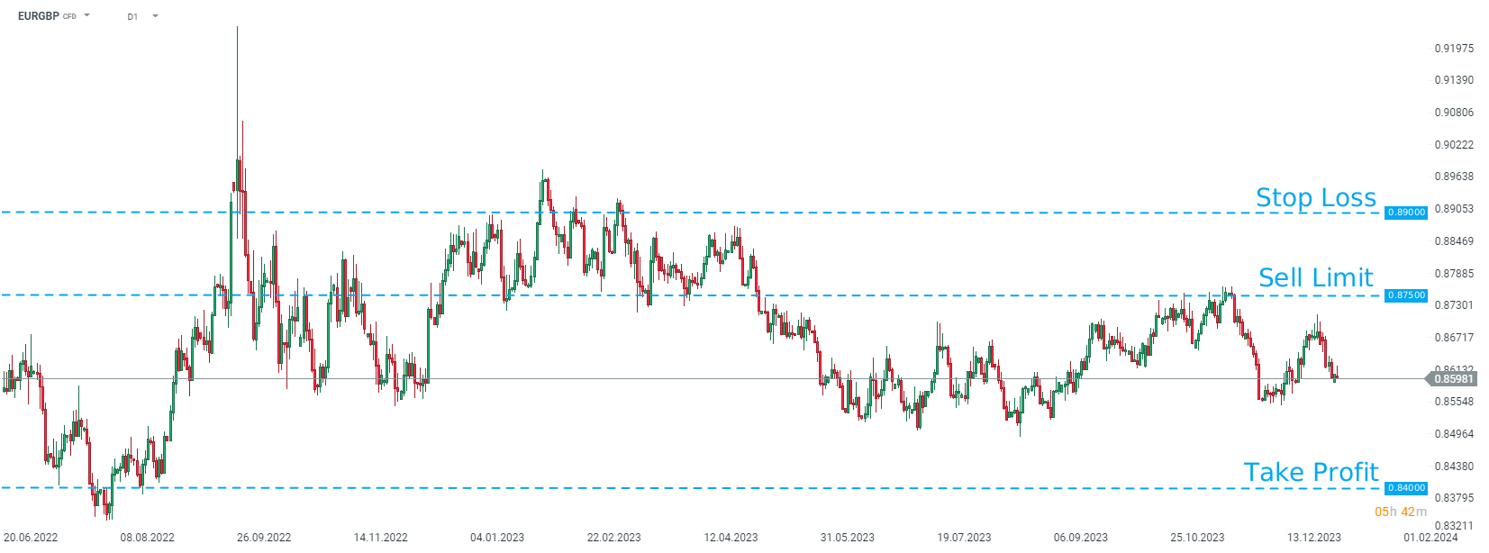 ANZ recomienda tomar una posición corta en EURGBP con una orden límite en 0,8750, un objetivo en 0,8400 y un stop loss colocado en 0,8900. Fuente: xStation5