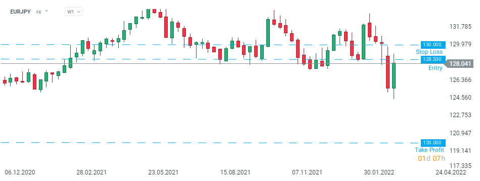 BOFA recomienda tomar una posición corta en el EURJPY a 128.53 con un objetivo de 120.00 y un stop loss puesto en 130.00. Fuente xStation5