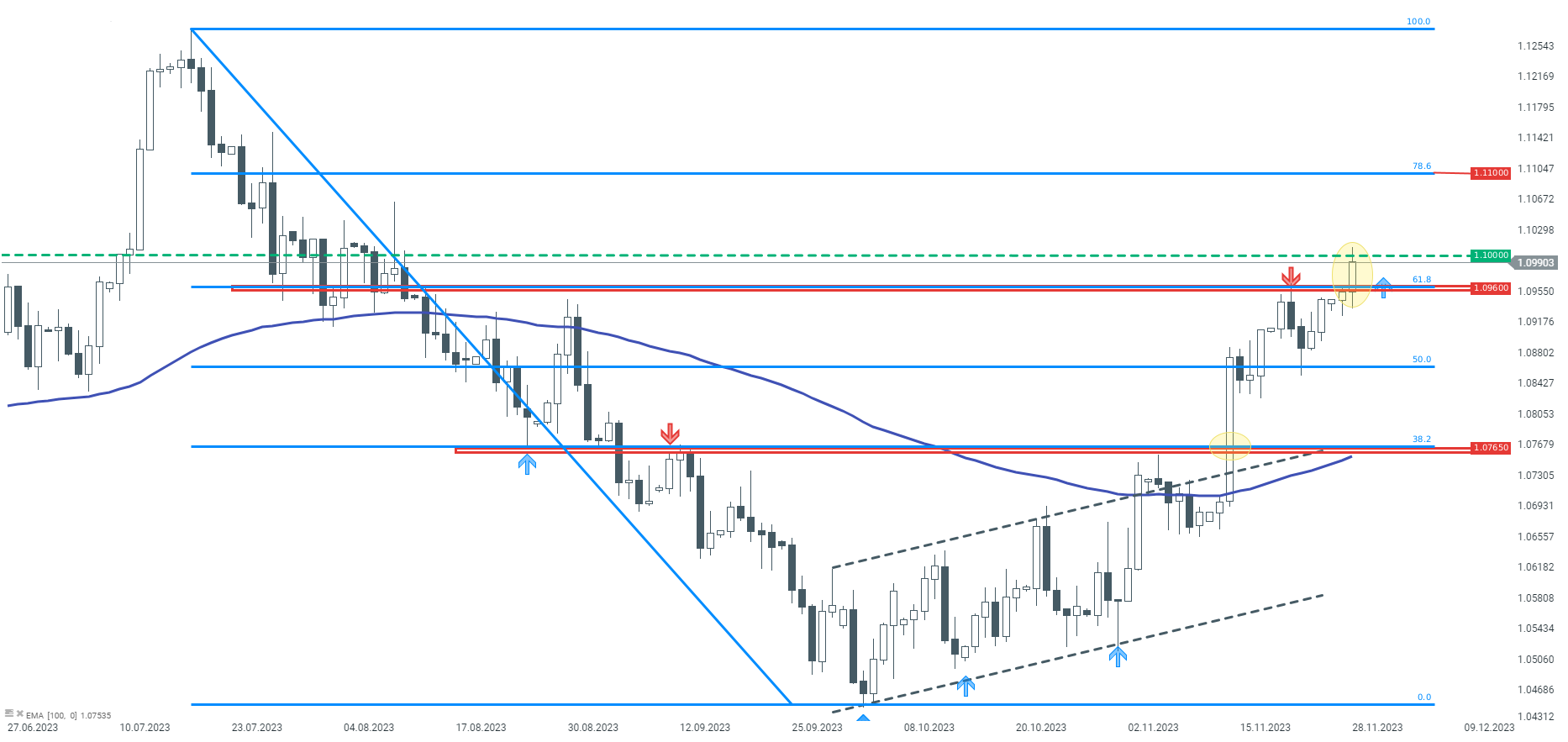 Las cotizaciones del eurodolar han superado el nivel redondo de 1,1000 por primera vez desde mediados de agosto de este año. En cuanto a la situación técnica, el sentimiento alcista prevalece desde principios de octubre. El movimiento alcista cobró fuerza el 14 de noviembre cuando los datos de inflación del IPC de EE.UU. indicaron una caída más rápida en el crecimiento de los precios. La intensidad del movimiento alcista continuó y los vendedores sólo aparecieron en el nivel de resistencia de 1,0960, que se deriva de medir el 61,8% de Fibonacci de toda la última onda bajista, contando desde el pico de julio. Romper la resistencia indicada en la sesión de hoy puede incluso abrir el camino hacia el próximo retroceso de Fibonacci, en el nivel 1,1100.