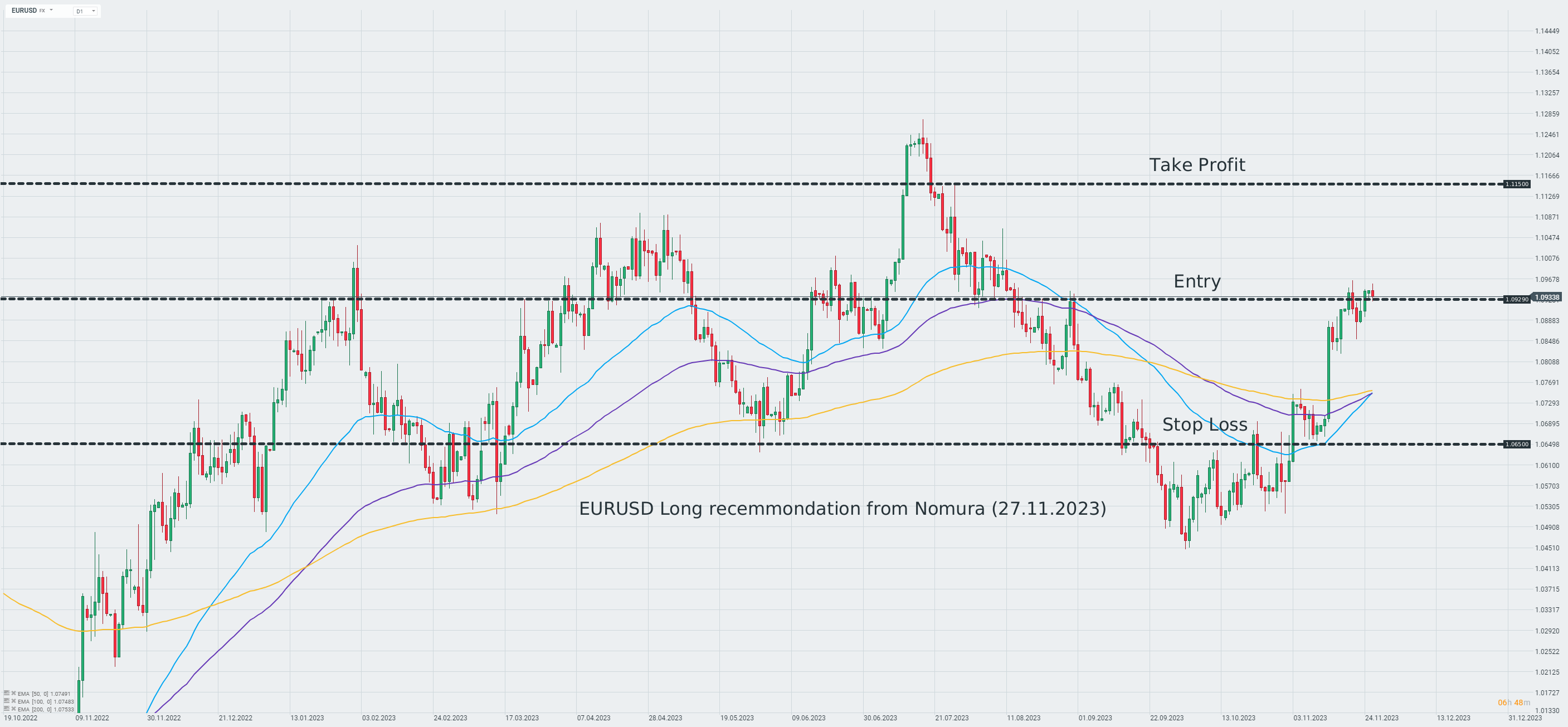 Nomura recomienda tomar una posición larga en EURUSD al precio de mercado con un objetivo de 1,1150 y una orden de stop loss en 1,0650. Fuente: xStation5