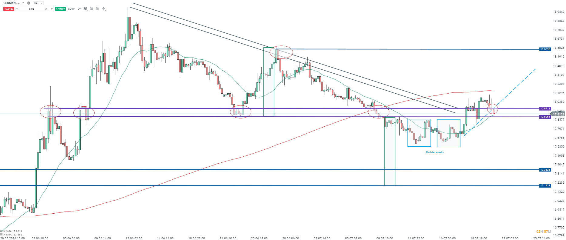 El gráfico de USDMXN muestra un doble suelo en la zona de los 17.8861, lo que indica un posible cambio de tendencia hacia el alza. Esta figura técnica es una señal alcista importante y su confirmación se daría con la ruptura del nivel de los 18.0156. Además, se observa una clara tendencia bajista previa con la formación de máximos decrecientes, evidenciada por las líneas de tendencia descendentes.
