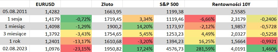 En 2011, el índice S&P 500 fue el que peor reaccionó y el oro fue el mayor beneficiario, aunque eso se debió a un repunte del precio de los bonos. ¡Un mes después de la decisión, tuvimos una caída de rendimiento de más de 50 puntos básicos! Como se puede apreciar, la situación de la moneda se mantuvo estable, aunque también fue consecuencia de los problemas europeos. Aunque ahora no hay una crisis de deuda en la Eurozona, podemos ver problemas significativos con la desaceleración económica. Fuente: Bloomberg Finance LP, XTB Research