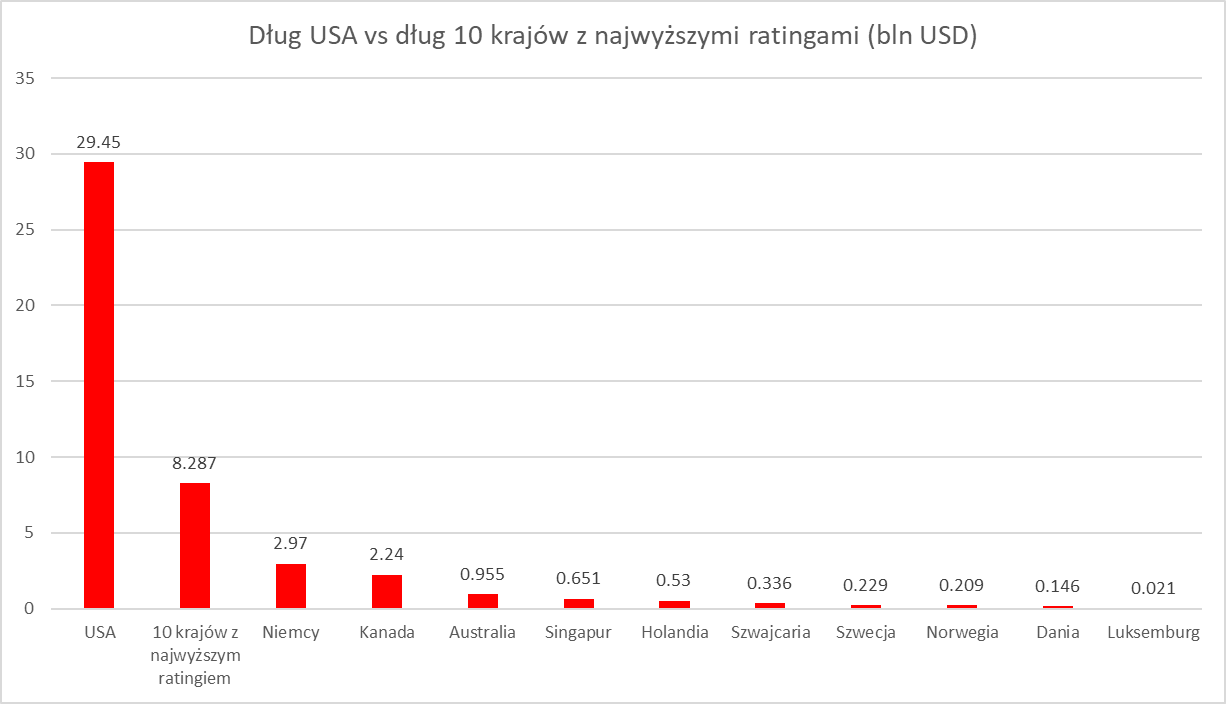 Fitch mostró en el fundamento de su decisión que la gestión de la política fiscal se ha deteriorado significativamente en los últimos 20 años. Tales advertencias ya se produjeron en 2011 por parte de S&P, y Moody's también sugirió en mayo que podría decidir sobre tal movimiento. Cabe mencionar que la política de inversión de algunos fondos muestra que el dinero sólo se puede invertir en la deuda más segura con calificación AAA. Por lo general, entonces, como comités de inversión, prestan atención a la calificación vigente y, desde esta perspectiva, podría parecer que la decisión de Fitch es clave, ya que la calificación vigente para EE.UU. no es AAA sino AA+. Sin embargo, hay un "problema". El mercado de deuda actual de EE. UU. es casi cinco veces más grande que el mercado total de todos los demás emisores gubernamentales con una calificación AAA de todas las agencias y casi cuatro veces más grande considerando los países con una calificación AAA predominante. Entonces, ¿a dónde iría el dinero de la deuda estadounidense si los gestores quisieran moverlo mecánicamente? Incluso si la deuda de los EE.UU. no tiene un estatus especial para una institución dada (que suele ser el caso), sería más fácil cambiar las disposiciones que dejar los bonos de los EE.UU. Por cierto, este hecho también significa que la deuda de los gobiernos que han retenido AAA puede ser particularmente valorada por los inversores (ya que queda muy poco).