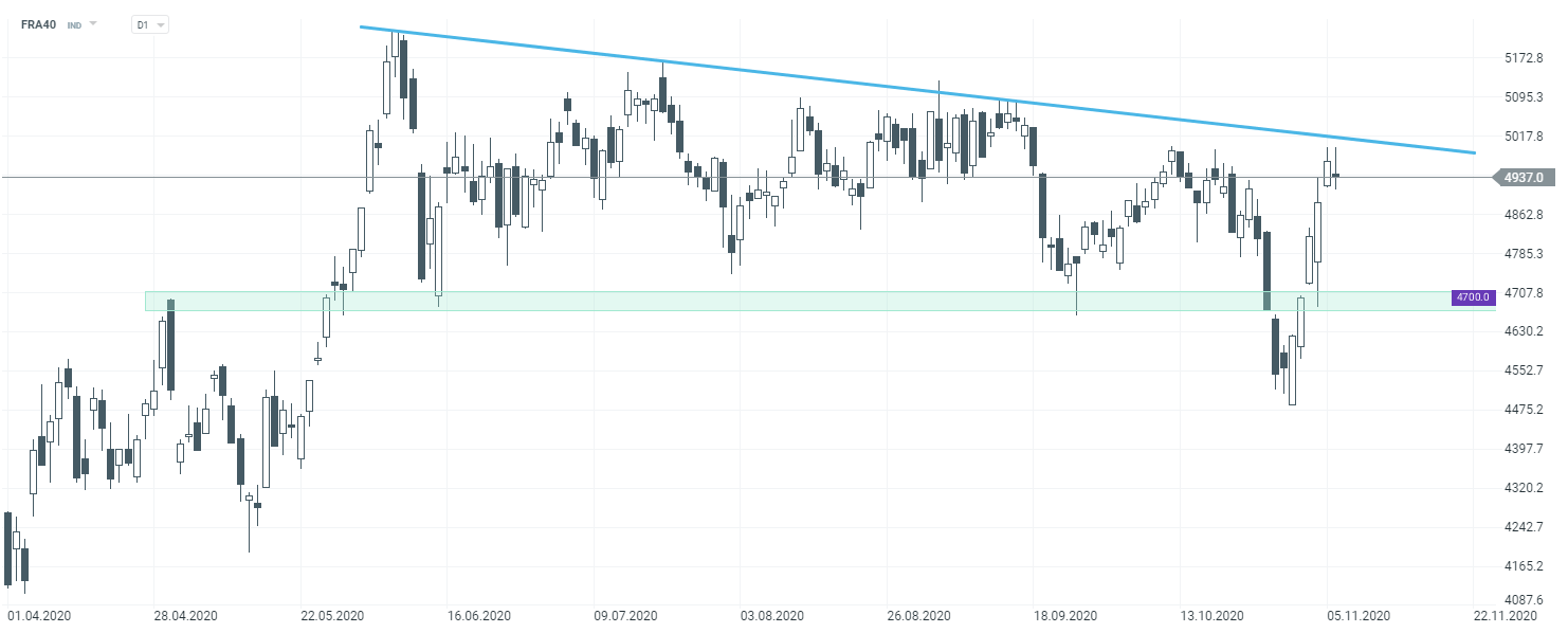 Tras una falsa ruptura por debajo del soporte clave, FRA40 se recuperó y se acercó a un nivel de resistencia importante (línea de tendencia bajista - observe una secuencia clara de máximos más bajos). Mientras tanto, el área en 4.700 pts sigue siendo un soporte crucial. Fuente: xStation5