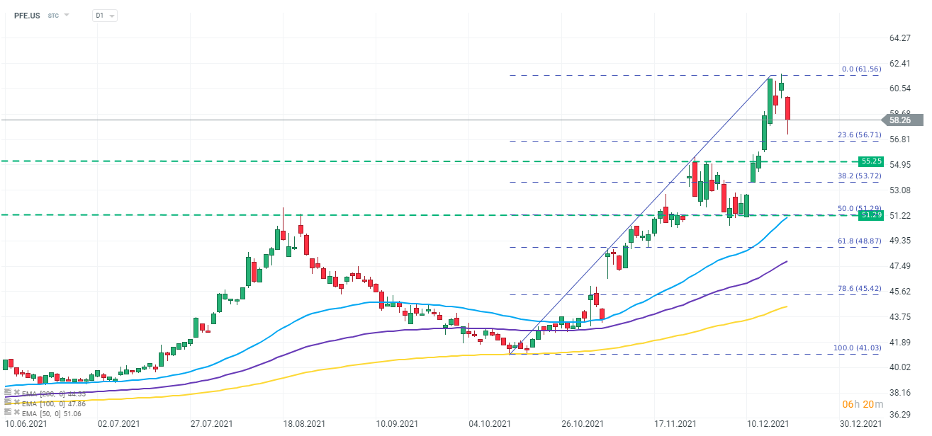 Pfizer (PFE.US), intervalo D1. Actualmente, las acciones del gigante médico están cayendo desde máximos históricos y se cotizaban hoy cerca del retroceso de 23,6 Fibonacci. La compañía se ha movido en una fuerte tendencia alcista durante más de dos meses, con una sólida estructura de soporte al nivel de USD 55 por acción (el pico local, que rebotó, y una estrecha convergencia de los retrocesos del 23,6% y 38,2%). . Fuente: xStation 5