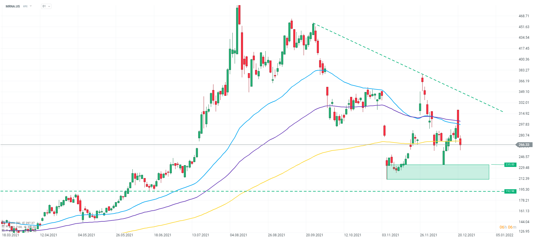 Acciones de Moderna (MRNA.US), intervalo D1. Las acciones de Moderna se mueven en una tendencia bajista dinámica, que durante el último mes comenzó a tomar la forma de un triángulo de tendencia bajista incompleto. Una ruptura por debajo del soporte a un nivel de 235 USD por acción puede alentar al lado de la oferta a acelerar las caídas hasta el área de soporte de 193 USD por acción. Por otro lado, si se puede defender la zona de soporte verde, la próxima resistencia será la ruptura por encima de la EMA 200 (línea amarilla). Fuente: xStation 5