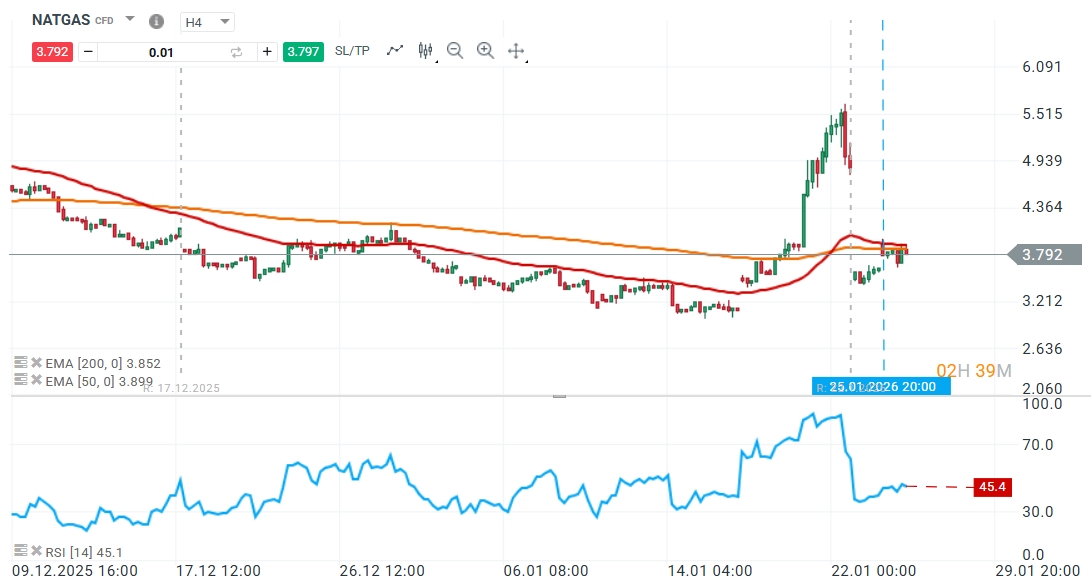 A pesar de los precios récord en el mercado físico, la acción del precio muestra un escenario de cautela. Actualmente, el Gas Natural oscila en torno a los 3,780 dólares, un nivel que viene acompañado de un impulso de 45,4 puntos en el RSI, lectura que denota una falta de apoyo real por parte de la fuerza compradora para mantener el aumento sostenido. Esta debilidad estructural se ve reforzada por la posición de las medias móviles exponenciales (EMAs) de 50 y 200 periodos, las cuales oscilan levemente por encima del precio de negociación actual, actuando como una resistencia dinámica difícil de penetrar en el corto plazo.