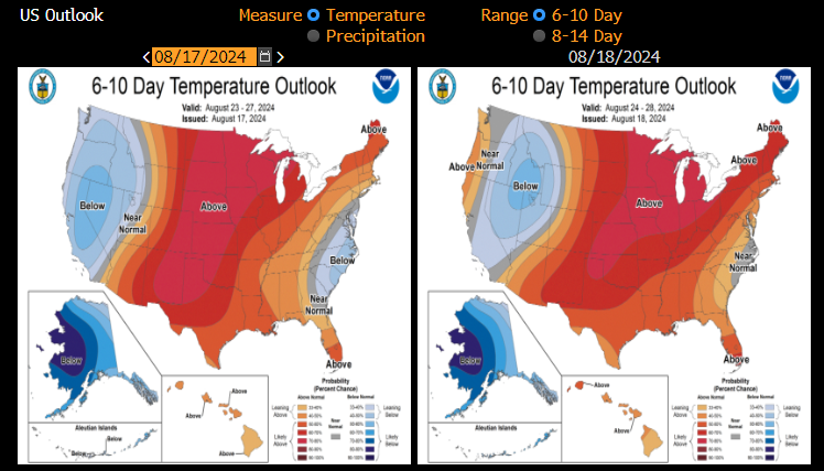 Se espera que los próximos 6 a 10 días sean especialmente calurosos en los estados centrales. Durante el período de 8 a 14 días, hará calor en todo Estados Unidos, aunque las desviaciones no serán extremas. Fuente: Bloomberg Finance LP