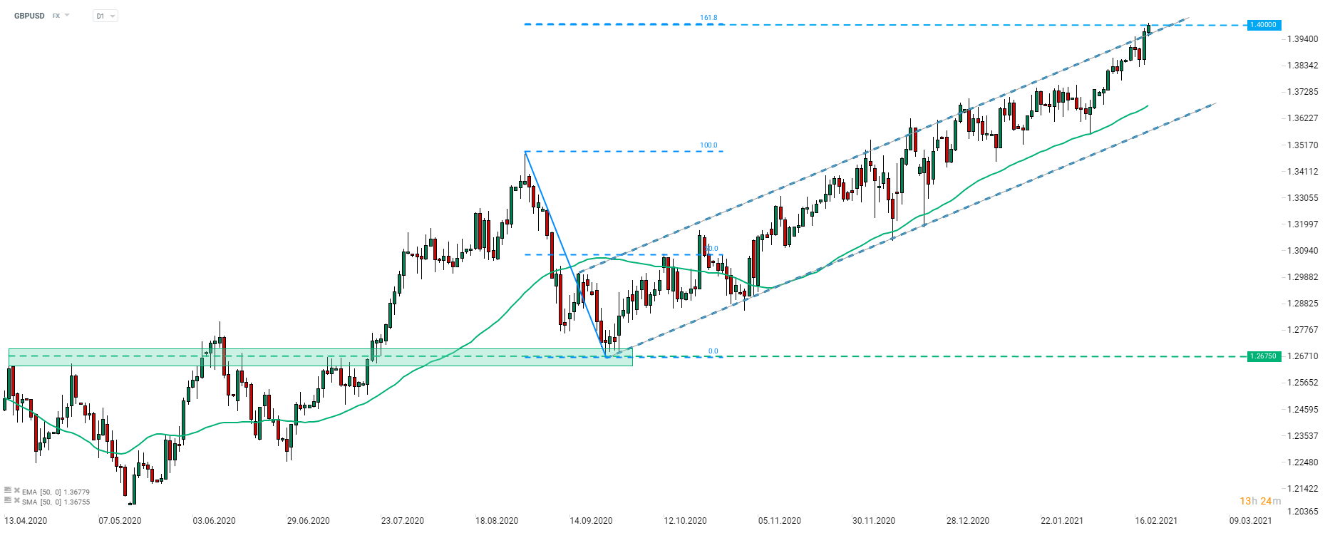 El GBPUSD ha estado operando en un canal alcista desde finales de septiembre de 2020. El par ha visto más allá del reciente fortalecimiento del USD y continuó ganando. Ayer se produjo una ruptura por encima del límite superior del canal y hoy el par está probando el nivel de 1,40$ por primera vez desde abril de 2020. El área de 1,40$ se fortalece adicionalmente por el retroceso exterior del 161.8% del movimiento bajista de agosto a septiembre de 2020. Sólido conjunto de los PMI de febrero del Reino Unido está impulsando el sentimiento hacia la libra esterlina. El indicador de fabricación pasó de 54,1 a 54,9 (exp. 53,1) mientras que el índice de servicios saltó de 39,5 a 49,7 (exp. 42,0). La lectura contrasta con las lecturas alemanas y francesas que mostraron una caída del indicador del sector de servicios más de lo esperado.