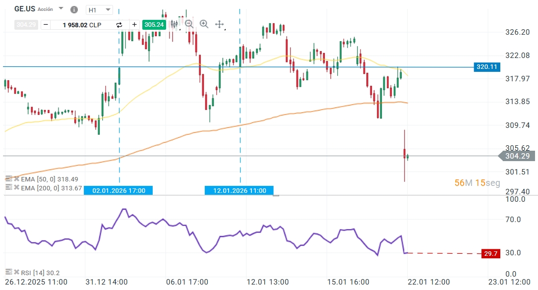 La cotización de General Electric se encuentra actualmente bajo presión de venta, negociándose en torno a los US$ 304,29. A pesar de haber reportado resultados fundamentales robustos, el sentimiento del mercado parece estar penalizando la incertidumbre sobre su capacidad de fabricación de nuevas unidades, un factor que contrasta con el crecimiento acelerado en su división de servicios de mantenimiento de flotas.