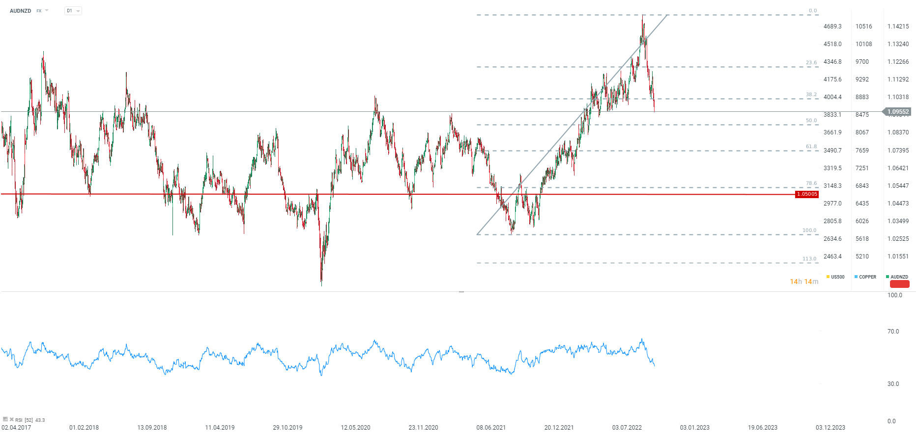 Probablemente estamos viendo un aumento en la divergencia entre el banco central de Australia y Nueva Zelanda. En el caso de Nueva Zelanda, se espera que los tipos de interés alcancen el 5% el próximo año, mientras que en Australia es poco probable que los tipos de interés alcancen el 4%. Además, la debilidad de China no es una buena señal para el AUD. Por lo tanto, el par AUDNZD continúa cayendo significativamente. El par de divisas ya está por debajo del nivel de 1,10 y se dirige a un retroceso de 50,0 de la última ola alcista significativa. El nivel clave de soporte a largo plazo es de alrededor de 1,05.