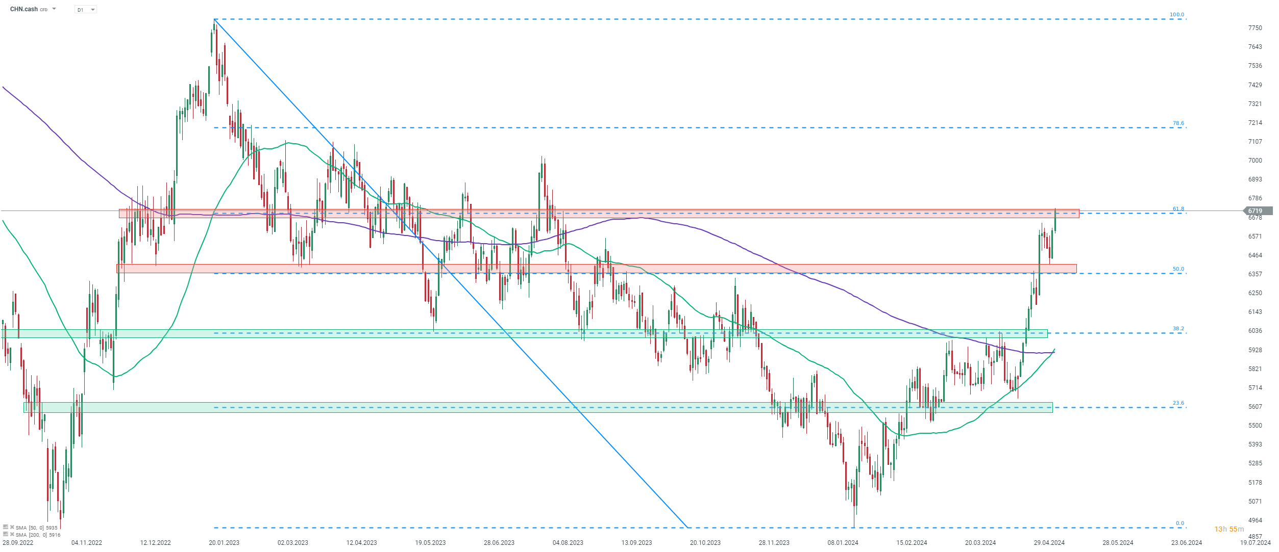 Si observamos el gráfico CHN.cash en el intervalo D1, podemos ver que el índice ha experimentado un repunte masivo en los últimos meses. El índice saltó más del 35% desde el mínimo alcanzado el 22 de enero de 2024. CHN.cash subió al nivel más alto en 9 meses. Actualmente, el índice prueba la zona de resistencia de 6.700 pts, marcada con un retroceso del 61,8% del impulso bajista lanzado a principios de 2023.