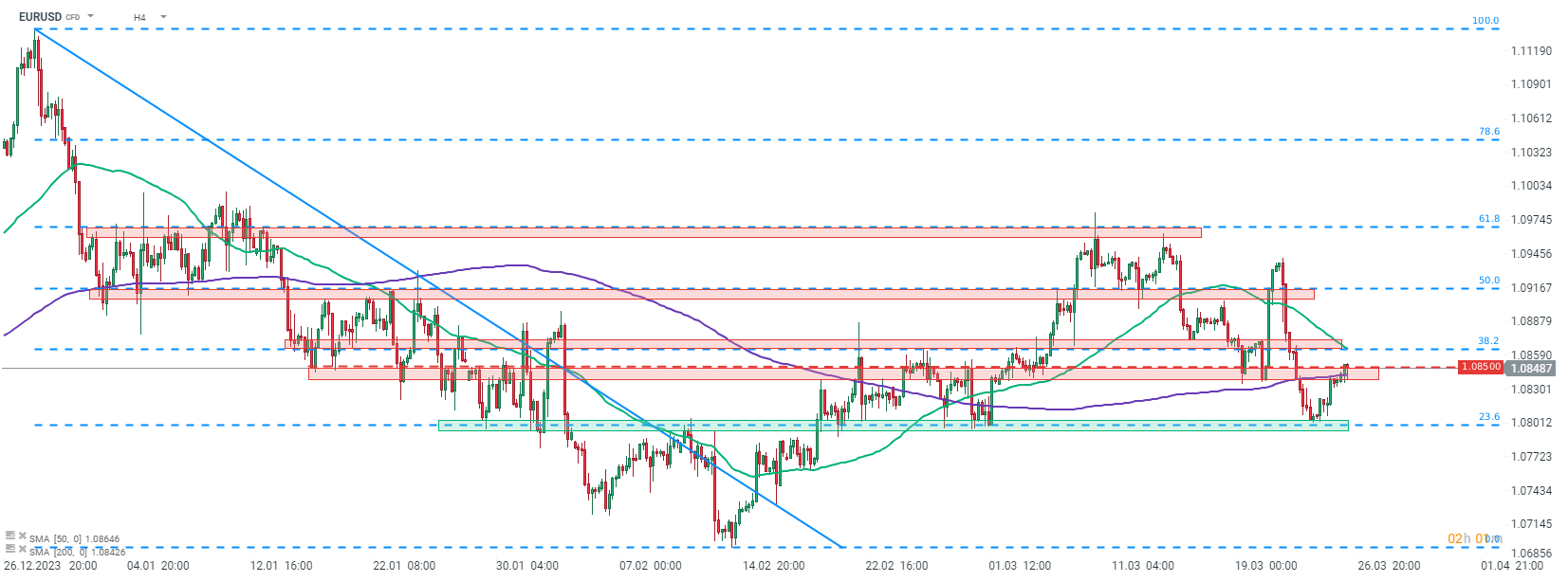 La semana pasada estuvo marcada por el fortalecimiento del USD, pero esta tendencia se está poniendo a prueba esta semana. Si observamos el gráfico EURUSD en el intervalo H4, podemos ver que se detuvo el retroceso de la semana pasada en la zona de soporte de 1.0800, marcada con un retroceso del 23,6% del movimiento bajista lanzado a finales de diciembre de 2023. Esta semana se lanzó un movimiento de recuperación con El par sube hoy a la zona de resistencia de 1.0850, marcada por el promedio móvil de 200 períodos (línea morada), así como por reacciones de precios anteriores. La siguiente resistencia potencial a tener en cuenta, en caso de una ruptura al alza, se puede encontrar en el área de 1,0865, marcada con un retroceso del 38,2% y una media móvil de 50 períodos (línea verde).