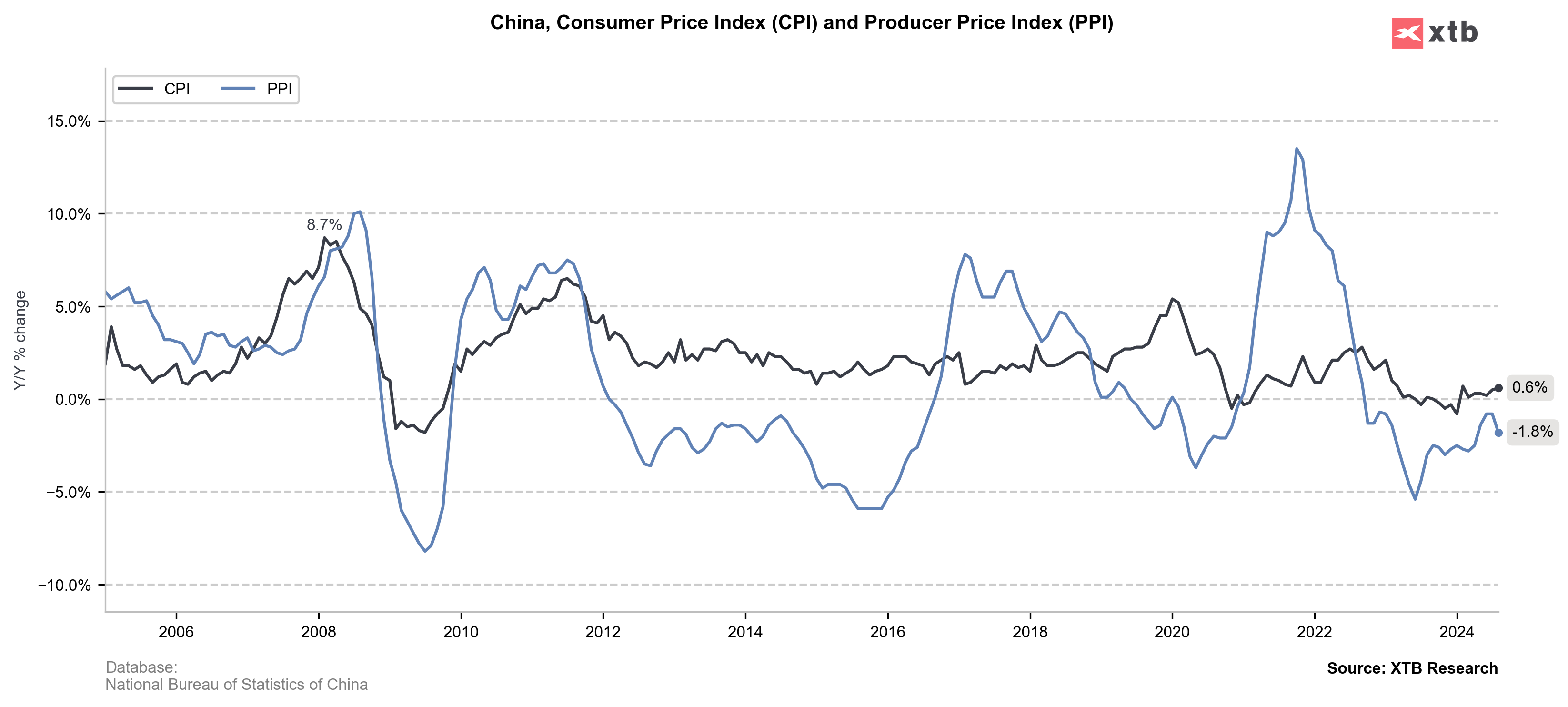 El índice de precios al consumidor (IPC) de China aumentó un 0,6% interanual en agosto, por debajo del aumento esperado del 0,7%. Este modesto crecimiento extiende un período de debilidad económica que ha durado más de un año. Mientras tanto, el índice de precios al productor (IPP) disminuyó un 1,8% interanual, marcando el 23er mes consecutivo de contracción y superando la disminución anticipada del 1,4%. Estas cifras subrayan la lucha continua con la débil demanda interna y el exceso de capacidad en varios sectores.