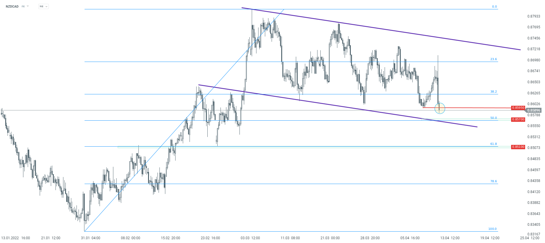Echando un vistazo al gráfico de NZDCAD en el intervalo H4, podemos ver que el par ha estado operando en un canal bajista durante algún tiempo. Un movimiento alcista desencadenado por la subida de tipos del RBNZ se detuvo en el retroceso del 23,6 % del rally lanzado a finales de enero de 2022. Durante la mañana europea se puede observar una ruptura por debajo de la zona de soporte de 0,8595, marcada con un máximo local anterior. En caso de que el BoC dé una sorpresa de línea dura y aumente el CAD, el par puede mirar hacia el área de 0.8570 como el próximo soporte.