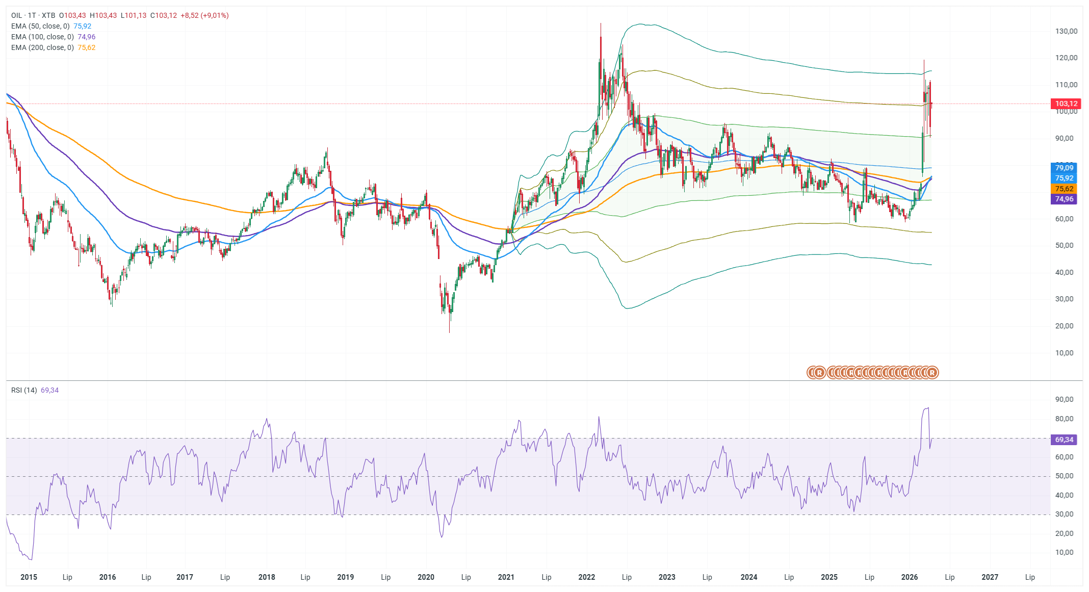 El RSI se acerca al nivel de 69, y el precio se ha alejado claramente de todas las medias móviles clave (EMA 50/100/200), que se agrupan en torno a los 75–76 USD, lo que refleja un fuerte impulso alcista.