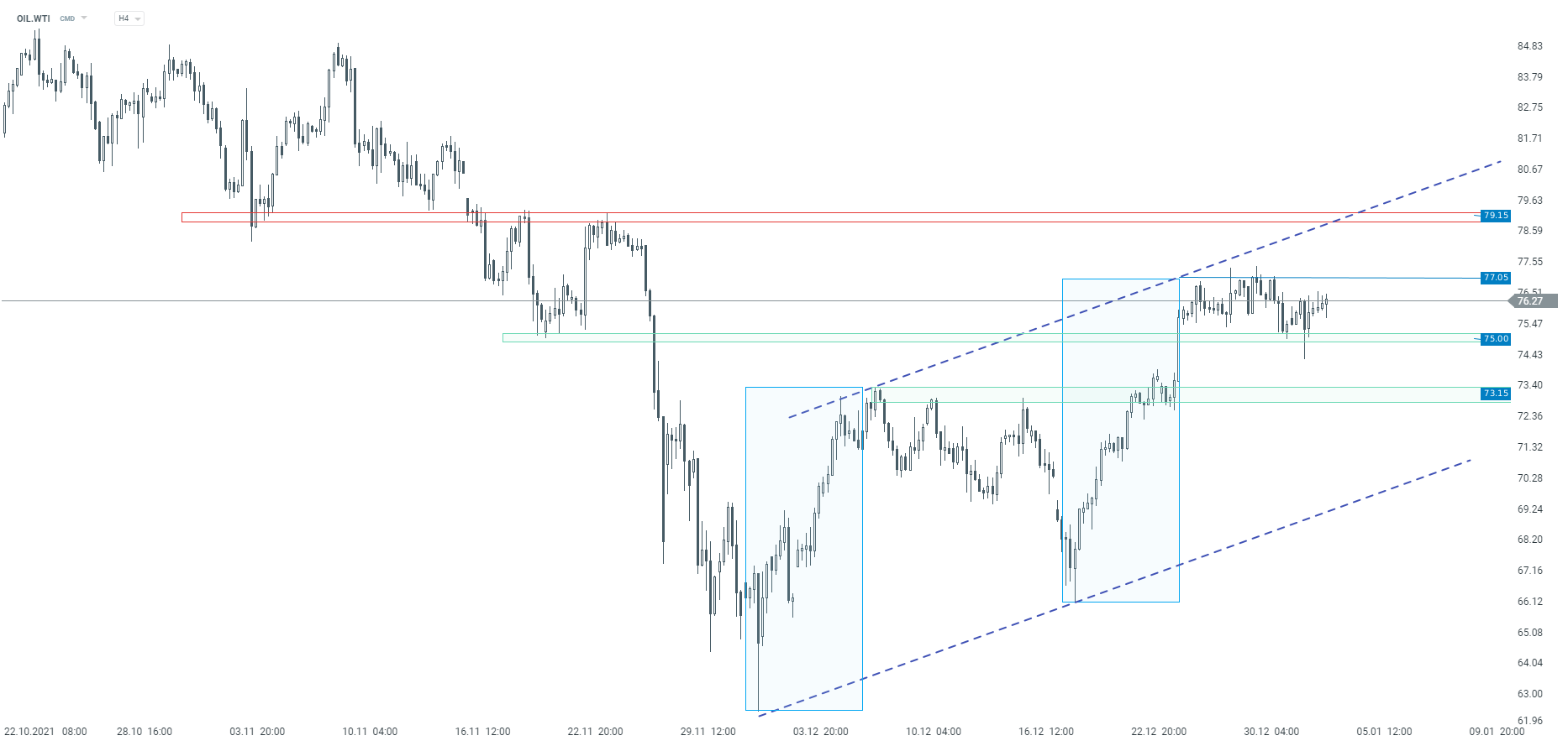 Echando un vistazo al gráfico OIL.WTI, podemos ver que el precio se detuvo después de alcanzar el área de 77.00 $ por barril y comenzó a cotizar lateralmente. Los operadores deberían tener en cuenta los límites del rango de negociación de 75-77 $ hoy, ya que los datos de OPEP+ y API pueden desencadenar algunos movimientos en el mercado. En caso de una ruptura por encima del límite superior en el área de 77 $ , la siguiente resistencia importante a observar se puede encontrar en el límite superior del canal ascendente (ligeramente por encima de 79 $).