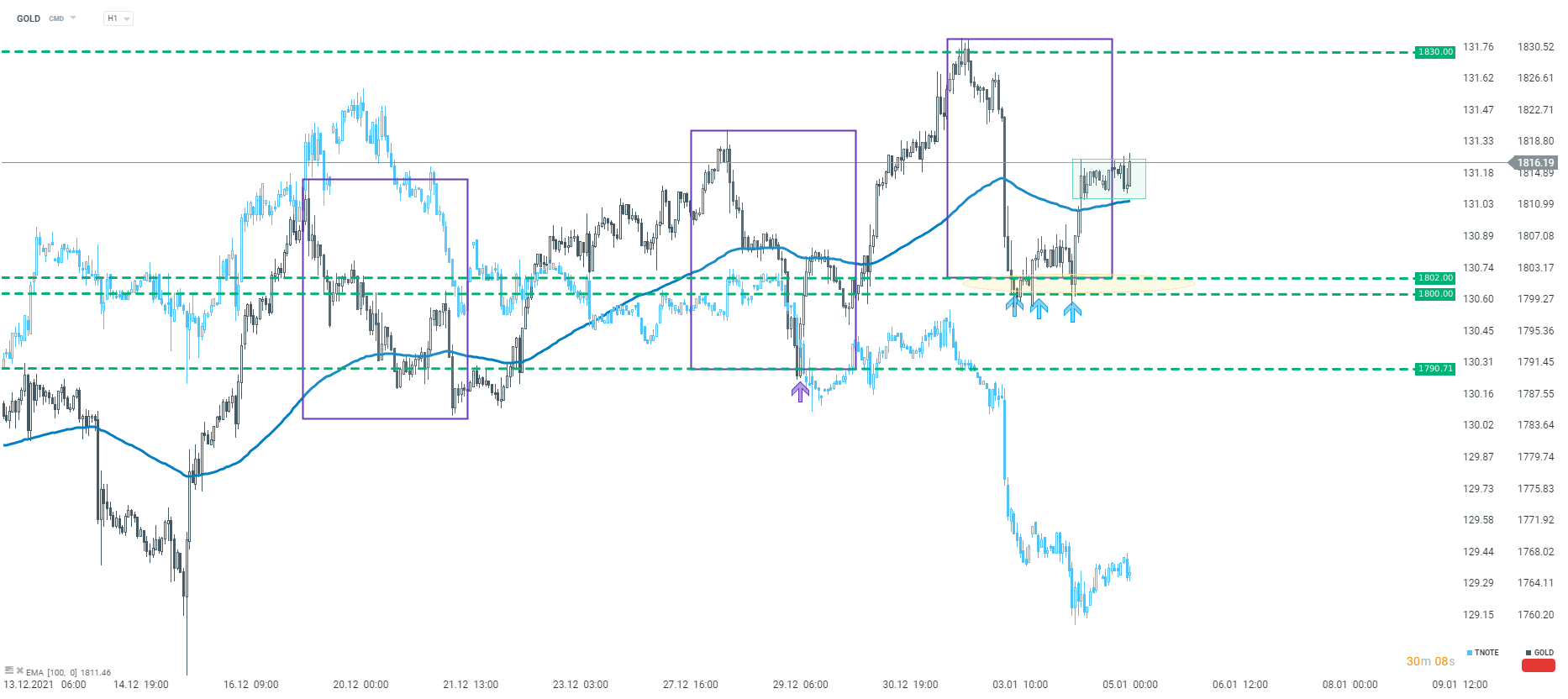 Un endurecimiento más rápido de las políticas en Estados Unidos no solo es potencialmente negativo para las acciones, sino también para los metales preciosos. Echando un vistazo al gráfico GOLD en el intervalo H1, podemos ver que el metal precioso ha rebotado en el área de $ 1,800, marcada con el límite inferior de una geometría de mercado, esta semana. Sin embargo, después de un breve movimiento alcista, el precio comenzó a cotizar lateralmente. La volatilidad en el mercado del oro en las últimas horas ha estado deprimida, lo que puede sugerir que los inversores están esperando pistas de las actas del FOMC. Habiendo dicho esto, se espera que la volatilidad en GOLD aumente cerca de los minutos de lanzamiento del FOMC (7:00 pm GMT).